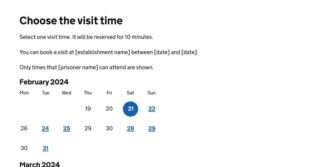 The calendar component enables users to select times from a calendar, for example to book an appointment.